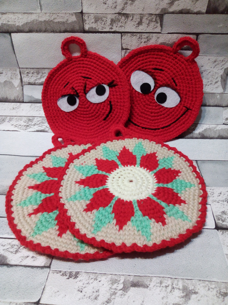 Здравствуйте . Предлагаю вам связать вместе со мной вот такие замечательные прихватки , для украшения любой кухни. Фетр . Пряжа , у меня детская новинка в две нити . Термо клей . Игла для сшивания . Светло жёлтый цвет . Далее вяжем по схеме чередуя цвета. Обвяжите край по схеме . Обрежьте и закрепите нить . Круг из фетра вырезаем чуть меньше , чем диаметр прихватки. С обратной стороны закрепите его. Красный цвет. Нить оставьте . Обвяжите край по кругу сп . Обрежьте и закрепите нить . Круг из фетра вырезаем чуть меньше , чем наша прихватка. Закрепите его с обратной стороны . Вышиваем брови и рот , а глаза вырежьте из фетра . Образец мордашек . Наши прихватки готовы. Приятного вязания !!!