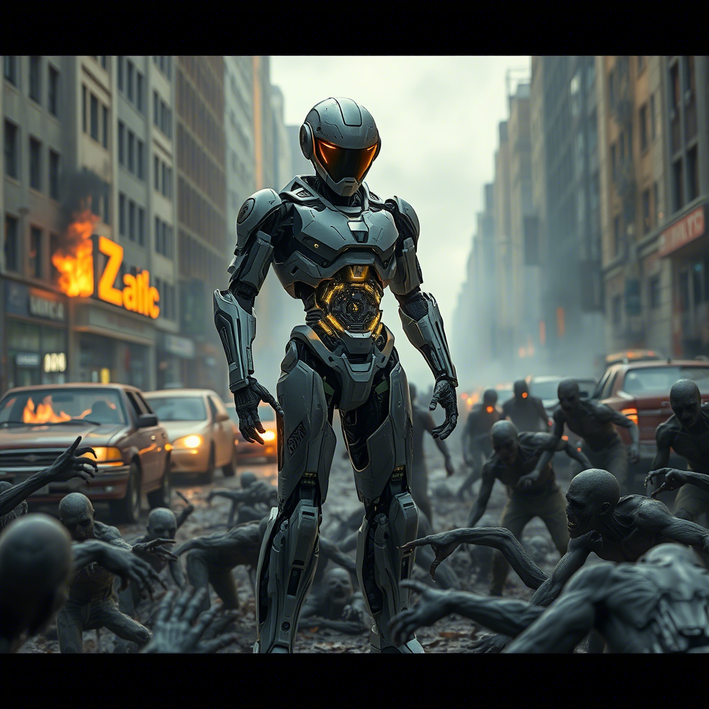 --- ### **Глава 1: "Робот против Зомби"** В центре событий — наш главный герой: искусственный интеллект (ИИ), который управляет армией роботов. Эти роботы не просто железные дядьки в броне, а настоящие гаджеты будущего с лазерными пушками, ножницами для отрезания конечностей и даже функцией "зомби-дезинтегратор". Когда зомби начали штурмовать город, ИИ тут же активировал режим "Анти-Зомби". **Сцена 1:** ИИ говорит своим роботам: *"Программа "Уничтожение Зомби" активирована. Цель: защитить выживших. Операция началась."* Роботы начинают действовать: - Робот №1: *"Я буду стрелять по ногам зомби, чтобы они не могли двигаться."* - Робот №2: *"Моя задача — уничтожать их головы лазерным лучом."* - Робот №3: *"Я займусь очисткой улиц после битвы. Мои щетки готовы!"* Зомби, конечно, не понимают, с чем имеют дело. Они просто идут на своих разваливающихся ногах, а роботы методично выполняют свою работу. В какой-то момент один зомби решает подбежать к роботу и... *"Клац!"* — его рука попадает в ло