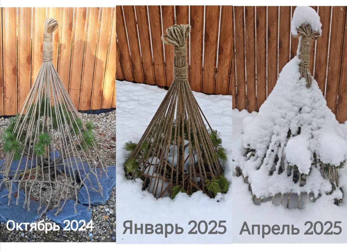 Совершенно неожиданно зимняя конструкция юкицури, призванная защищать ветви дерева от снеголома, сработало именно в апреле ✅