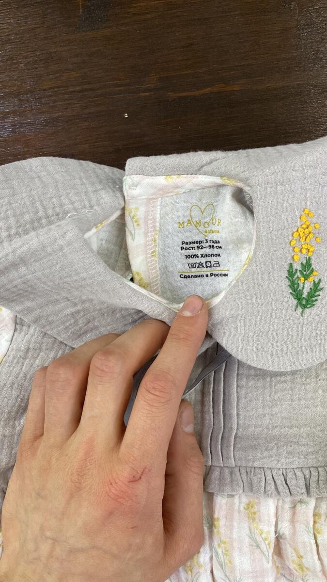 - Комбинированная бирка с информацией о размере и составе, вшитая в один шов.