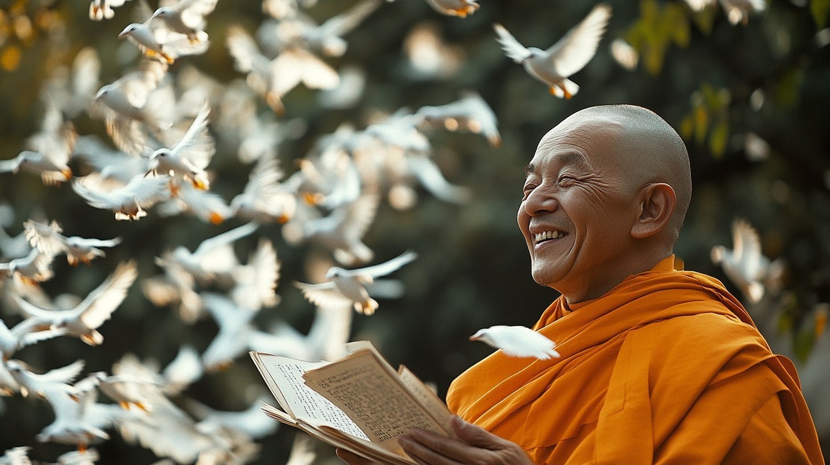 Создано на основе запроса: The monk smiling as pages of failed attempts flutter in the wind like liberated birds