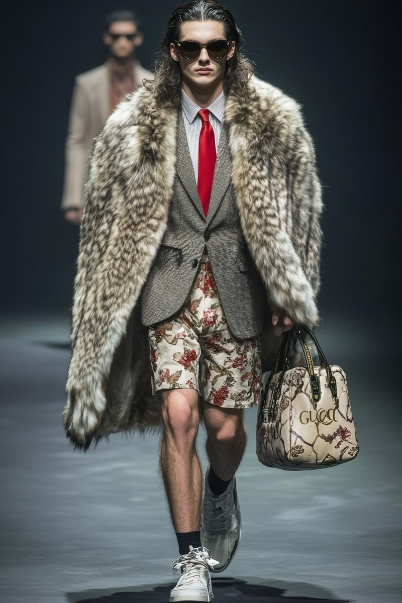Создано на основе запроса: A male model walks the runway wearing an oversized fur coat over his gray suit and red tie, no trousers, wearing shorts with flower print, with dark eyes and long hair in a slicked-back style, carrying a Gucci bag against a dark background. Face make up as jakudza. Wearing sport glasses. The image is a fashionable, full-body shot showcasing the model's long legs in a hyper-realistic photography style, from an award-winning photoshoot. --- Автоперевод: Мужская модель ходит по взлетно-посадочной полосе в негабаритном меховом пальто над своим серым костюмом и красным галстуком, без брюк, в шортах с цветочным принтом, с темными глазами и длинными волосами в стиле с заштрихованным списком, неся сумку Gucci на темном фоне. Хорошо вышло? 🤔 https://dzen.ru/id/65c0c65c86e4f837c27b24d7 #ИИ #AI #нейросеть #midjourney #art