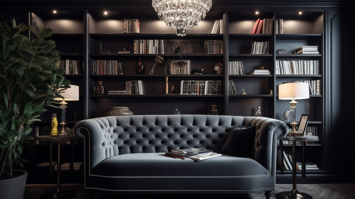 Создано на основе запроса: luxurious home office, elegant bookshelves filled with books, tufted velvet sofa with deep buttoning