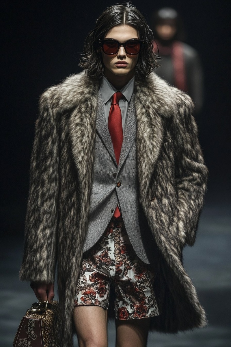 Создано на основе запроса: A male model walks the runway wearing an oversized fur coat over his gray suit and red tie, no trousers, wearing