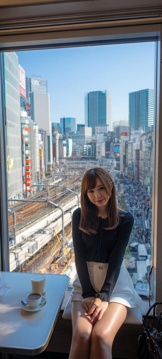 Создано на основе запроса: Morning cafe, skyscraper city and trains can be seen from the window, Japanese 25yo woman, front shot