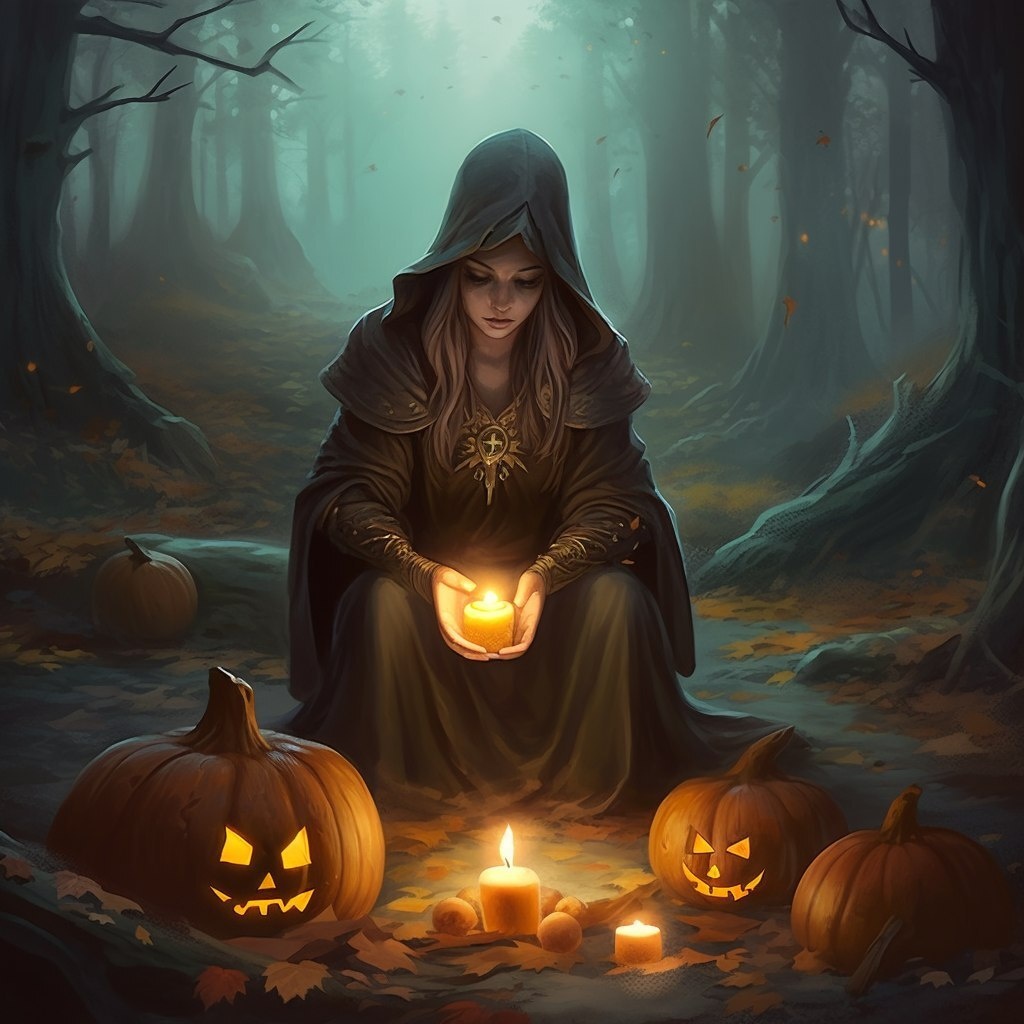 Создано на основе запроса: A beautiful young witch holding kneeling in a forest holding a candle, Holloween, pumpkins, magic the gathering