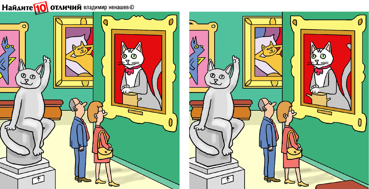 10 отличий. Загадка для внимания. Искусство для музея и картины в рамках. Но кто на картинах?