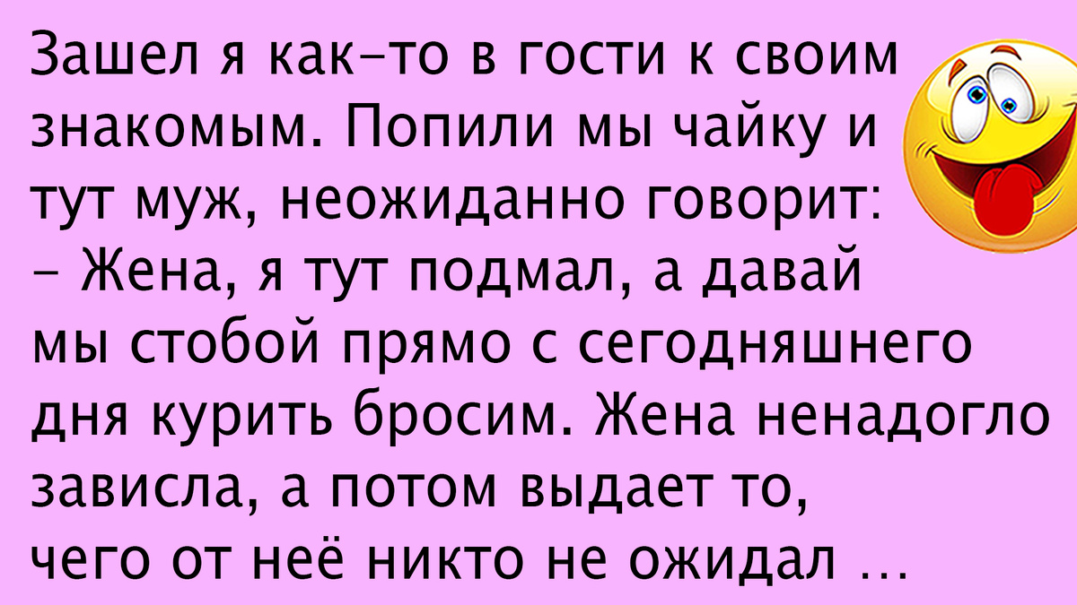 Что я могу сказать – вел я, мягко говоря не лучший образ жизни. И вот, мозгами понимаю, что это неправильно и плохо, а душа всё время тянет на приколючения … Это, знаете, как в анекдоте про мужа и жену. У меня, кстати, такие знакомые были – веселые ребята. Никогда с ними не заскучаешь. Вот есть у них талант – из любой ситуации, даже самой пчеальной, выисвивать повод для радости. Я к ним частенько в гости заглядывал, особенно на праздники. Правда, иногда после праздников им мысли непонятные в голову приходят. Сидим мы как-то с ними на кузне и чай пьем. Муж посмотрел внимательно на жену и говорит: - Слушай, жена, а давай мы стобой курить бросим? Та, в недоумении посмотрела на него: - Ааа, это зачем? Муж, немного сморщив лоб: - Как зачем? Ты представляешь сколько можно денег в месяц сэкономить? Жена ненадолго зависла. Было видно, что у неё в голове зашевелились какие-то мозговые шестеренки и она выдала: - Хорошо, но давай мы тогда с тобой еще и пить с сегодняшнего дня бросим? Муж, аж чуть