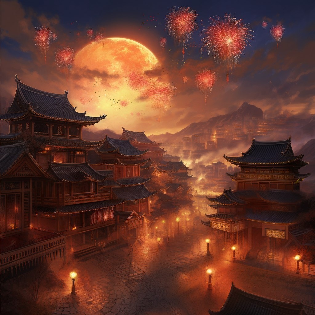 Автоперевод: Древний китайский город во время китайского Нового года, фейерверки в сумерках, магия, стиль искусства, высокий определение