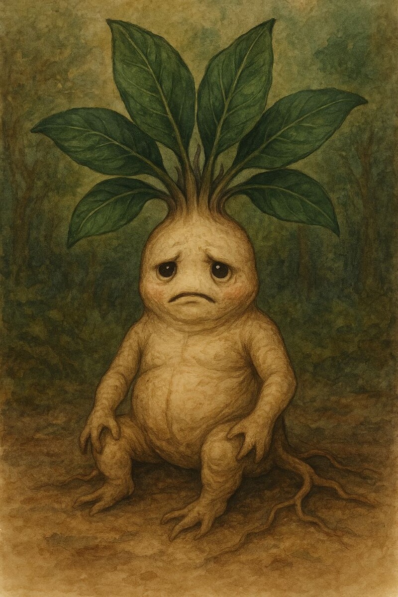 🍂✨ 🌿 Мандрагора: корень, что шепчет в темноте Тайна, что дремлет под землёй Когда ветер касается трав на закате, и вечерняя тень опускается на край леса, среди папоротников и колючих ветвей прячется древнее растение — мандрагора. Она растёт там, где редко ступает человек, и её корень — не просто плоть земли, а почти человек. Не зря о ней слагали легенды алхимики, ведьмы и короли. 🌱 Что такое мандрагора? Мандрагора (Mandragora officinarum) — это многолетнее растение из семейства паслёновых. Она действительно существует, и её корень поразительно напоминает человеческую фигуру. Бывает, что у мандрагоры «ножки», «руки» и даже голова. Именно из-за этого сходства с людьми её корень оброс мифами, страшилками и заклинаниями. Растёт на юге Европы, в Средиземноморье, в горных районах Турции, Греции, в Малой Азии. Любит тёплый климат и каменистые, известковые почвы. Цветёт фиолетовыми, синими или белыми цветами, а летом даёт ягоды, похожие на маленькие жёлтые яблочки (их звали «яблоками ведьм»