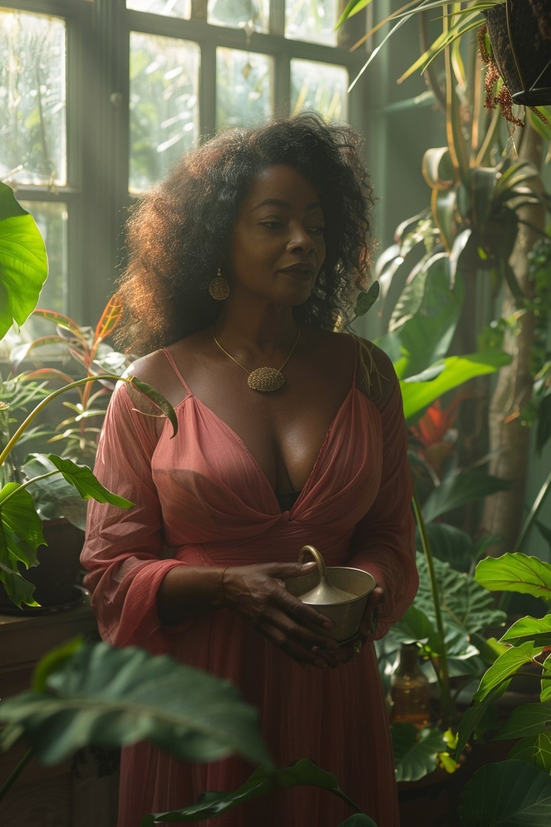 Создано на основе запроса: A fat dark-skinned Black woman in her late 40s, watering plants in a lush indoor plant sanctuary. She wears a flowing fuchsia pink wrap dress with gold jewelry, her expression peaceful and focused. She holds a small gold or white watering can, gently tending to tall leafy plants and hanging greenery around her. Sunlight filters through a nearby window, casting soft light on the pink, gold, black, and white details of the room. The atmosphere is nurturing, spiritual, and grounded --- Автоперевод: Жирная темнокожая чернокожие женщины в конце 40 лет, поливая растения в пышном заповеднике в помещении. Классно выглядит? 🤔 https://dzen.ru/id/65c0c65c86e4f837c27b24d7 #ИИ #AI #нейросеть #midjourney #art