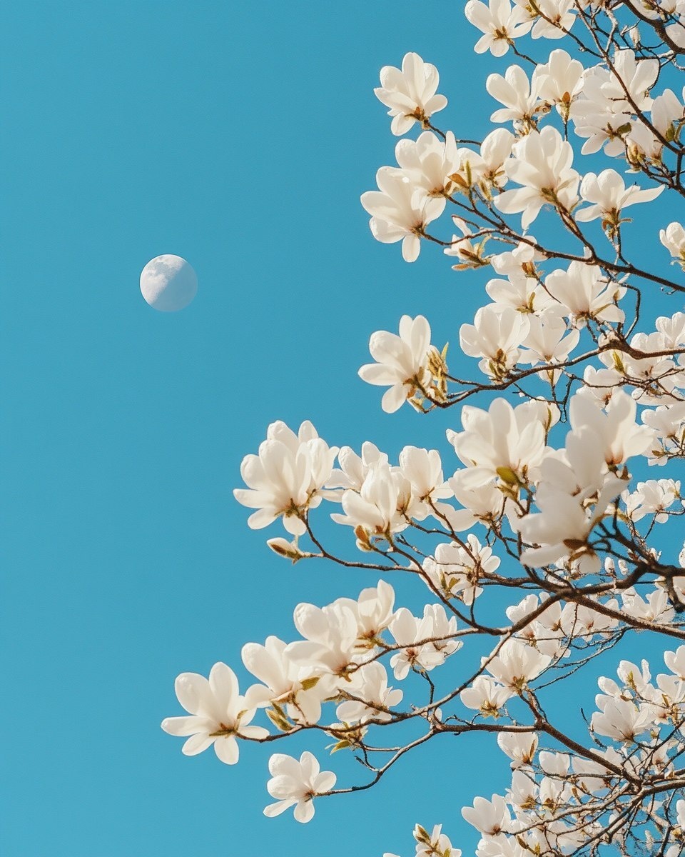 Создано на основе запроса: A photograph of white magnolia blossoms, with the moon in a clear blue sky, in a minimalist style, shot with a