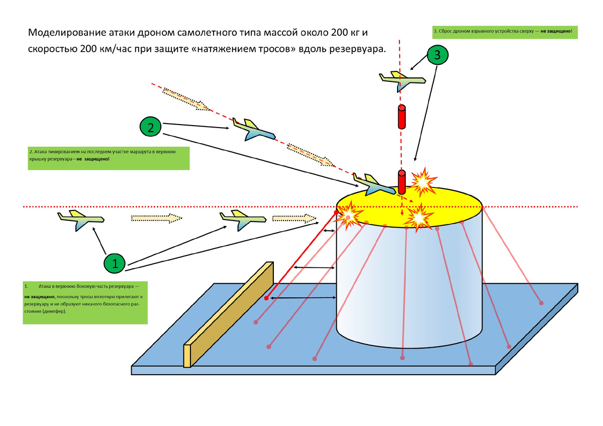 Условия: Параметр Без защиты Тросы (шаг 50 см) Пробитие резервуара Высокий риск Средний риск Пожар Очень вероятен Вероятен (если взрыв