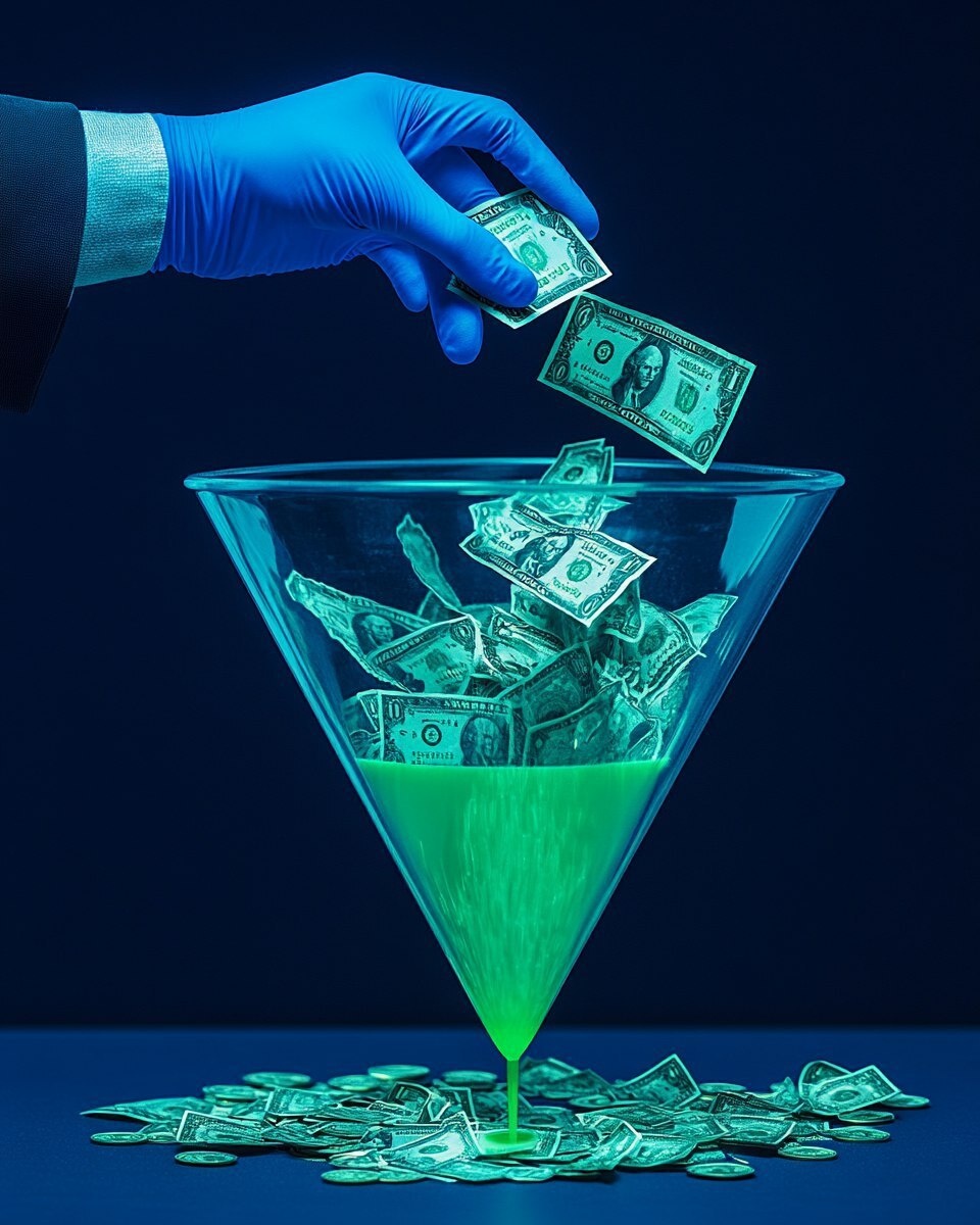 Создано на основе запроса: side view of person in corporate clothing with blue gloves adjusting dials on a funnel-shaped device with money flowing through it, navy blue backdrop, mint green funnel symbol, white space reserved in top left corner, commercial photography look, --- Автоперевод: Вид на сторону человека в корпоративной одежде с синими перчатками, регулирующими циферблаты на воронкообразном устройстве с деньгами, протекающими через него, темно-синий фон, символ зеленой воронки мяты, белое пространство, зарезервированное в верхнем левом углу, коммерческий образ фотографии, Неплохо получилось? 🤔 https://dzen.ru/id/65c0c65c86e4f837c27b24d7 #ИИ #AI #нейросеть #midjourney #art