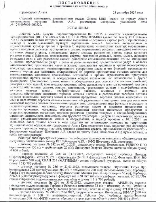 Вот мы смотрим постановление о привлечении в качестве обвиняемого, (23 сентября 2024 года) в котором указано, что продав Шевченко недоброкачественную продукцию, «Лобачев А.Ю. с места преступления скрылся». Кроме этого в постановлении зафиксирована сумма полученных от Шевченко средств на 4.5 миллионов рублей.