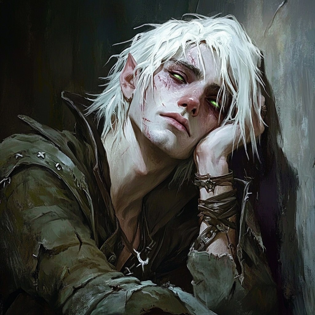 Создано на основе запроса: dnd character portrait, male, white hair, pale skin, dark circles under the eyes, one eye green, one eye brown, exhausted face, lean statue