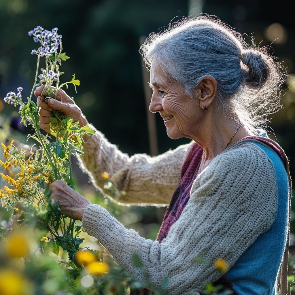 Создано на основе запроса: side view of a beautiful woman about 70 years old, looks like a grandma, gardening, she's pulling a mullein