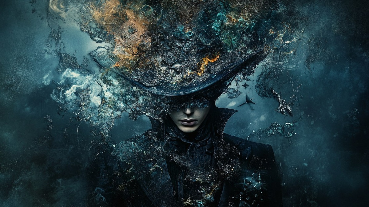 Создано на основе запроса: in the art stlye of by Zhang Jingna and hints of Karol Bak, create an abstract surreal portrait of a MAN against a surreal background, dark moody lighting, high fashion photo shoot styling, modern surrealism, high fashion glamour, cinematic lighting, luxury texture, 64K UHD resolution, Topaz Gigapixel clarity,