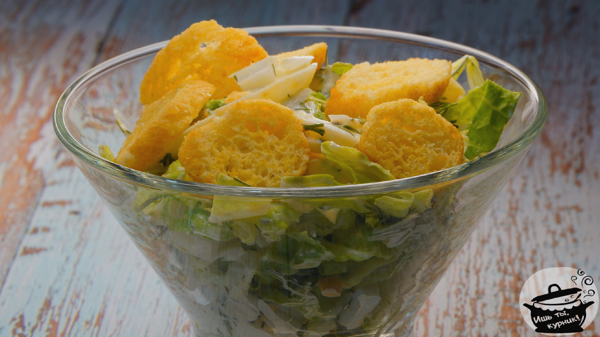 Ингредиенты: · листья пекинской капусты – 6 шт.; · яйца – 3 шт.; · сухарики – 1 пачка; · сметана – 2 ст.л. Приготовление: Яйца отварить. Зеленую часть листа порезать тонкой соломкой, а белую порезать кубиком. Яйца порезать тонкими ломтиками, смешать с пекинской капустой, заправить сметаной и солью по вкусу. Перед подачей добавить сухарики. Приятного аппетита!