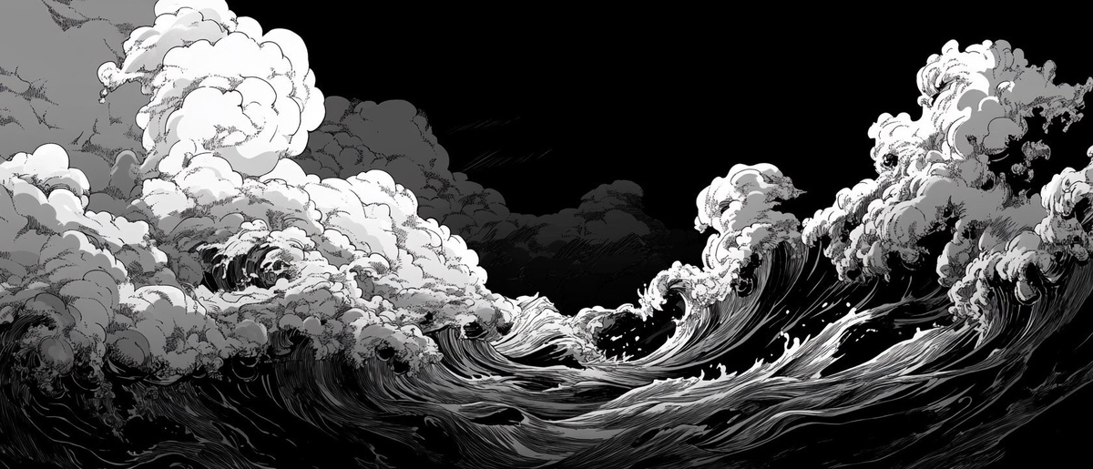 Создано на основе запроса: draw in black ink comics vintage style; a giant snake-like serpent rising from a lake under the light of the