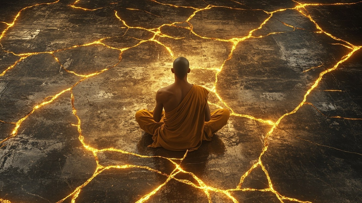 Создано на основе запроса: The monk meditating on a cracked floor that glows with golden veins like kintsugi