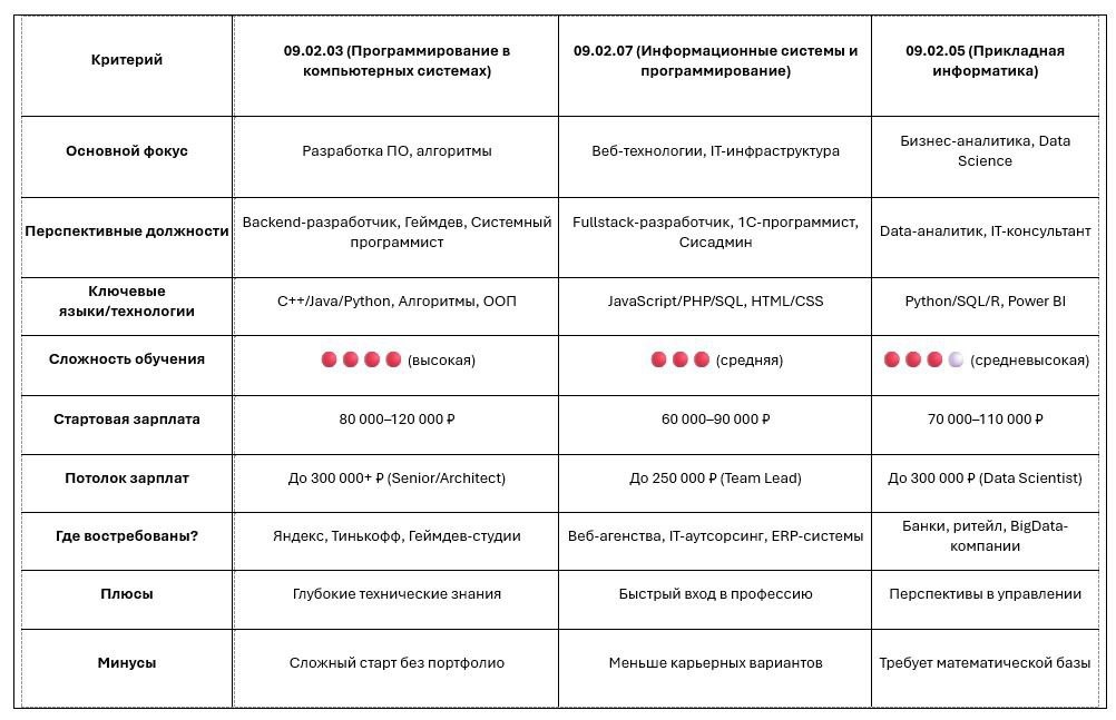 🎯 3 самых денежных IT-направления в колледжах (СПО) Готовясь к очередной консультации, я решила поделиться здесь информацией, которую будем обсуждать с юношей 9 класс при встрече. У него интересный профессиональный профиль: предпринимателя и менеджера, но рассмотрим мы с ним профессии в IT. Почему и с чего? Это другая история и профессиональный секрет: как я понимаю, откуда я знаю что предложить и почему!😉 1️⃣ 09.02.03 — Программирование в компьютерных системах. (Для тех, кто хочет писать код на уровне инженера) Что будете делать? ✔️ Разрабатывать софт (от мобильных приложений до игр) ✔️ Писать сложные алгоритмы и оптимизировать код ✔️ Работать с базами данных и системным ПО Кем устроитесь? • Backend-разработчик (Java/Python) — от 80к • Разработчик игр (Unity/C++) — от 90к • Инженер машинного обучения — от 120к Плюсы ✅ → Глубокие знания (конкурируете с вузовцами) → Доступ к сложным проектам (нейросети, ОС) Минусы ❌ → Сложный старт без портфолио ____ 2️⃣ 09.02.07 — Информационн