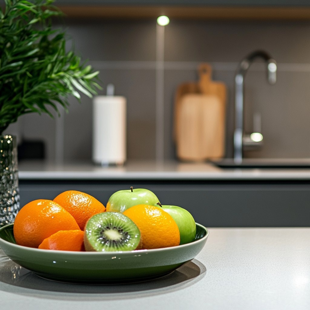 Создано на основе запроса: image of a cosy modern kitchen, in front a big modern green plate with apples, oranges, kiwi, next to a clean