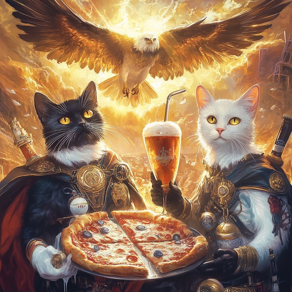 Создано на основе запроса: image that reflects these concepts: warriors of light, tuxedo space cats, pizza, beer, golden light, an eagle