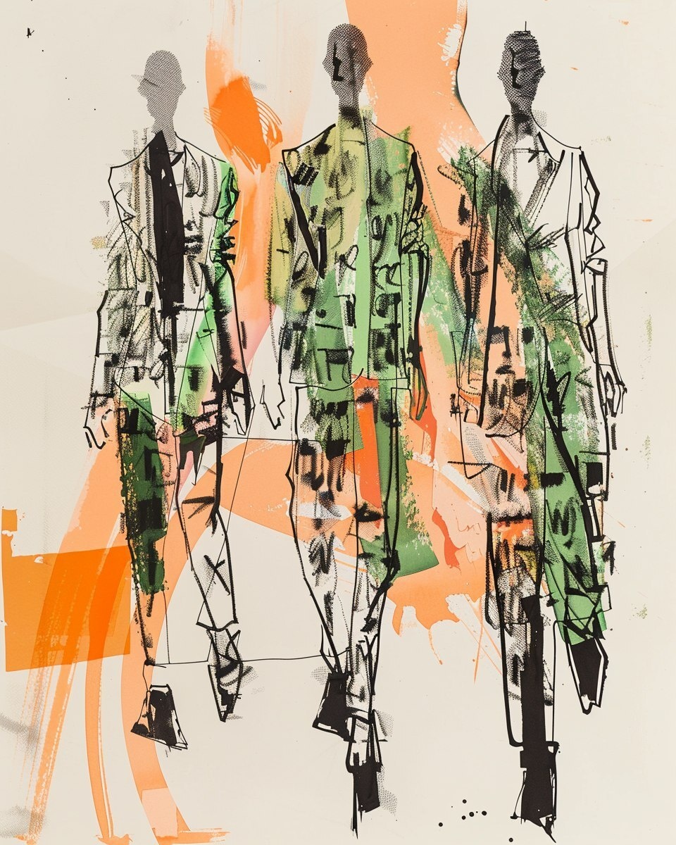 Создано на основе запроса: High-fashion conceptual sketch inspired by Maison Margiela and the surreal minimalism of Severance deconstructed officewear silhouettes in green tones (sage, moss, mint, chartreuse), experimental tailoring, unsettling symmetry drawn in bold black marker strokes, minimal peach watercolor wash, elongated figures in dynamic poses flat ivory background, no shadows expressive, gestural fashion illustration style, loose and stylized like 20th century fashion concept art --- Автоперевод: Концептуальный эскиз с высокой модой, вдохновленный Maison Margiela, и сюрреалистический минимализм деконструированных силуэтов офисной одежды в зеленых тонах (Sage, Moss, Mint, Chartreuse), экспериментального пошива, отрекающая симметрия, нарисованная в жирных черных маркерах, минимально-персиковые водяные, элегантные фигуры. Как тебе такой вариант? 🤔 https://dzen.ru/id/65c0c65c86e4f837c27b24d7 #ИИ #AI #нейросеть #midjourney #art
