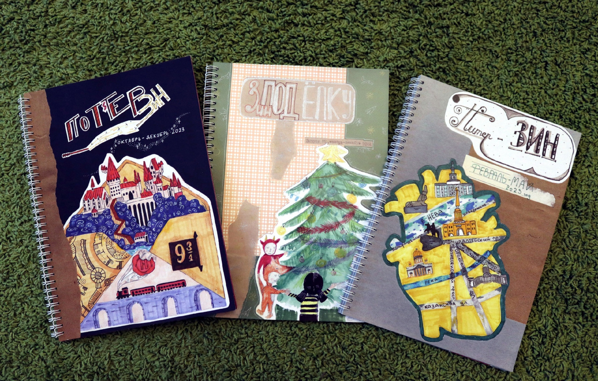 Больше года назад я рассказывала об одном стильном библиотечном проекте, который создала и продолжает вести моя коллега. Речь о Зин-редакции. Напомню, это встречи, на которых дети и их родители создают номера журналов. Сами рисуют иллюстрации, пишут от руки или печатают на машинке текст, оформляют развороты. Если захотите узнать подробную историю редакции, внизу прикрепила статью про Птичий зин. А сегодня покажу новые три выпуска, которые не так давно были напечатаны - это Питер-зин, Поттер-зин и Зин под ёлку. Я взяла по экземпляру каждого зина в свою домашнюю библиотеку, чтобы обязательно вам о них рассказать. Зин под ёлку. Ноябрь-декабрь 2022. Этот выпуск посвящен новогодним традициям России с дореволюционных времен по сей день. Читатель узнает о первой праздничной ёлке и ее украшениях. Отдельно рассмотрен период 1918-1928, когда решалось место Нового года и Рождества - религиозного праздника в новом атеистическом государстве. Немного позднее празднование вновь вернулось в виде всесо