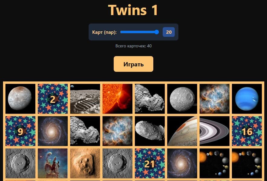 Это, наверное, самый простой вариант тренировки своей самой краткосрочной рабочей памяти. На поле (столе) расположены рубашкой вверх карты (картинки). Открываете их по одной. Если карта такая же, как предыдущая (двойник), то оставляете открытыми обе. Если нет — обе закрываете и откладываете в сторону, запоминая саму карту. Нужно открыть все карты. Игрушка очень простая — карты располагаются на поле. Кликом или тапом открываете очередную карту. И две последние карты либо остаются открытыми, либо обе закрываются. Можно выбрать количество открываемых карт. Они располагаются на экране в несколько рядов. В зависимости от размера устройства или сжатия/расширения окна число рядов меняется (адаптивная вёрстка). Самая примитивная стратегия — открывать по очереди карты. Наша краткосрочная память в состоянии хранить 7 плюс-минус 2 образа. Если в процессе открытия карт появится открывавшаяся ещё недавно — ваш мозг захочет открыть предыдущую такую же карту. Память человеческая индивидуальна. Кто-то