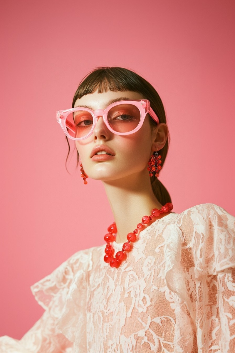 Создано на основе запроса: A model wearing a lace dress and pink glasses with a red beaded necklace on the runway, designed in the style of