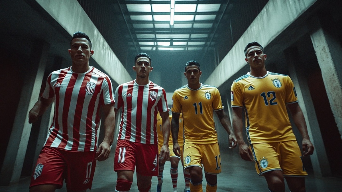 Создано на основе запроса: Full body shot, open shot of two lines of professional soccer players in a dramatic stadium hallway, 3 players from Chivas de Guadalajara on the left wearing red and white vertically striped jerseys, and 3 players from Club América on the right in yellow uniforms. They stand in formation, one behind the other, with serious and focused expressions, under intense, cinematic lighting. The hallway is dark with overhead lights, leading to a glowing stadium background. Warm tones with sharp contrast, depth of field, symmetrical composition, hyper-realistic sports photography, dramatic shadows and highlights --- Автоперевод: Полный удар, открытый выстрел двух линий профессиональных футболистов в драматическом коридоре стадиона, 3 игрока из Чивас -де -Гуадалахара слева в красной и белой вертикально полосатой майки и 3 игрока из клуба Америки справа в желтой форме. Отлично выглядит? 🤔 https://dzen.ru/id/65c0c65c86e4f837c27b24d7 #ИИ #AI #нейросеть #midjourney #art