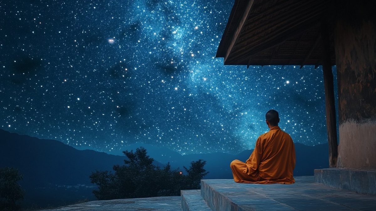 Создано на основе запроса: The monk gazing at the stars from a hut, wrapped in a thin robe but radiating peace