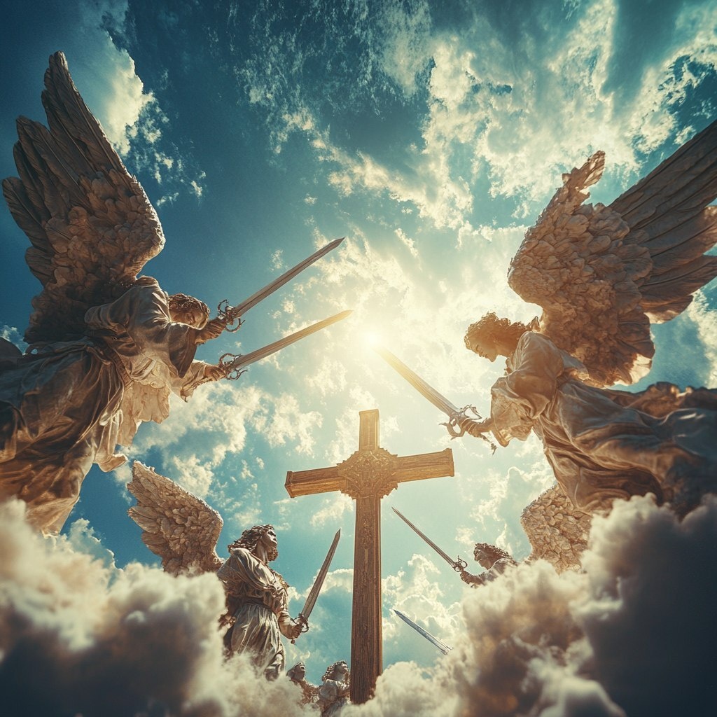Создано на основе запроса: sunny sky, giant wooden cross in the background, extreme close up of battle angels floating on clouds with swords pointing down surreal
