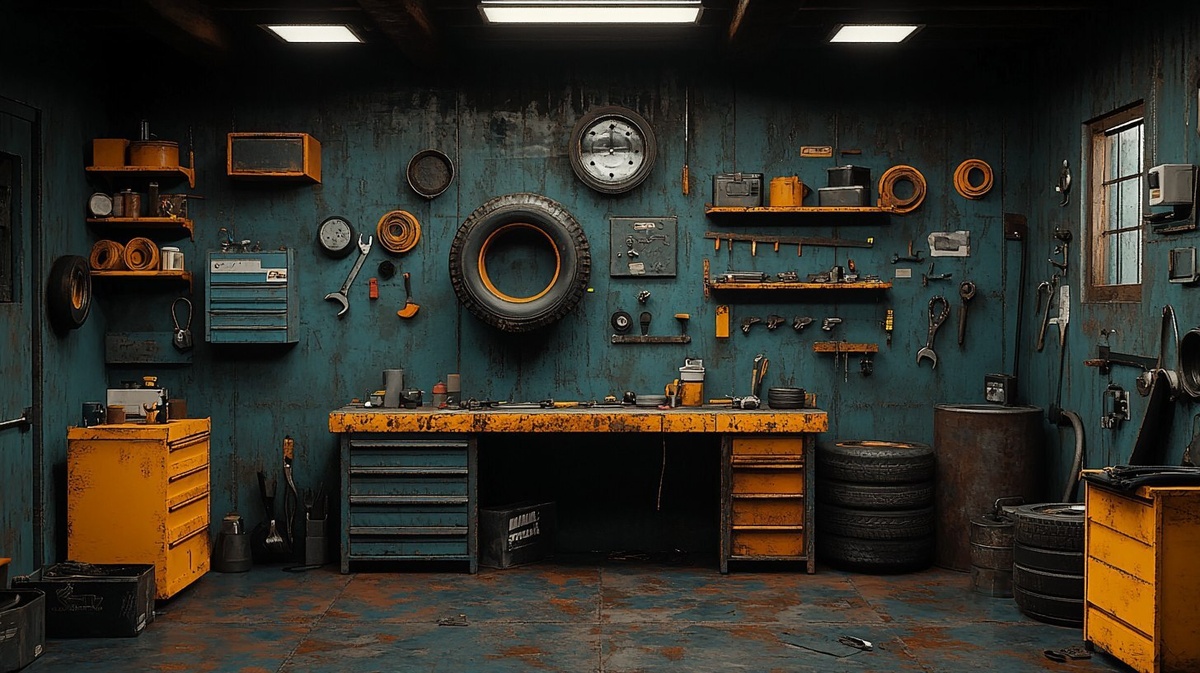 Создано на основе запроса: garage room, hanging tyre, rusted gray walls, no window, dark light, more tyres, auto repair tools, unmanaged
