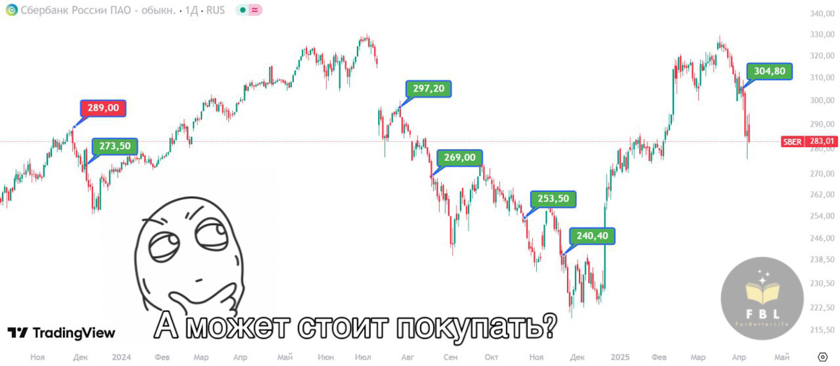 Π‘Π±Π΅ΡΠ±Π°Π½ΠΊΠ°. ΠΡΠ΅Π΄ΠΏΠΎΠ»ΠΎΠΆΠΈΠΌ, ΡΡΠΎ ΠΡ ΡΠ΅ΡΠΈΠ»ΠΈ ΠΈΠ½Π²Π΅ΡΡΠΈΡΠΎΠ²Π°ΡΡ Π½Π° Π΄ΠΎΠ»Π³ΠΈΠΉ ΡΡΠΎΠΊ ΠΈ ΠΊΡΠΏΠΈΠ»ΠΈ 10 Π°ΠΊΡΠΈΠΉ Π‘Π±Π΅ΡΠ° Π² Π½ΠΎΡΠ±ΡΠ΅ 2023 Π³ΠΎΠ΄Π° (Π³ΡΠ°ΡΠΈΠΊ Π½Π° ΡΠΎΡΠΎ ΠΎΡΡΠ°ΠΆΠ°Π΅Ρ ΠΏΠ΅ΡΠΈΠΎΠ΄ Ρ ΡΠ΅ΡΠ΅Π΄ΠΈΠ½Ρ ΠΎΠΊΡΡΠ±ΡΡ 2023 Π³ΠΎΠ΄Π° ΠΏΠΎ 8 Π°ΠΏΡΠ΅Π»Ρ 2025) ΠΏΠΎ ΡΠ΅Π½Π΅ 289β½ Π·Π° Π±ΡΠΌΠ°Π³Ρ (ΠΊΡΠ°ΡΠ½Π°Ρ ΠΌΠ΅ΡΠΊΠ°). ΠΠ°Π»ΡΠ½Π΅ΠΉΡΠΈΠΉ Π³ΡΠ°ΡΠΈΠΊ ΠΠ°ΠΌ Π±ΡΠ» Π½Π΅ΠΈΠ·Π²Π΅ΡΡΠ΅Π½, Π½ΠΎ ΠΡ ΠΏΡΠΈ ΠΊΠ°ΠΆΠ΄ΠΎΠΌ ΠΏΠ°Π΄Π΅Π½ΠΈΠΈ Π°ΠΊΡΠΈΠΉ ΠΎΡ Π»ΠΎΠΊΠ°Π»ΡΠ½ΡΡ
