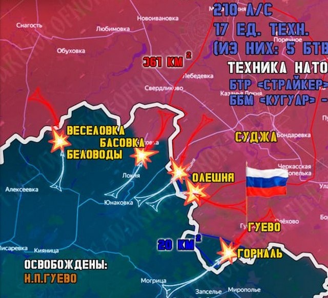 В группировке войск «Север» ВС РФ, завершающей освобождение от ВСУ Курской области и отражающей попытки прорыва противника в Белгородскую область, рассказали про текущую обстановку на сегодня в приграничье. Как уже сообщалось, вчера в ходе уникальной операции, продолжавшейся более 10 дней, ВС РФ полностью освободили приграничное село Гуево Суджанского района. Там оставались мирные жители которых противник пытался использовать как живой щит. Северяне ежедневно проводили эвакуацию людей из села, пожилых граждан выносили на носилках через леса. Сегодня утром наши военные вывезли в безопасные районы еще четверых жителей Суджанского приграничья. Продолжаются ожесточенные бои в селе Горналь и на хуторе Олешня. В Сумской области отбита безуспешная контратака ВСУ в окрестностях села Веселовки. Инженерные подразделения ВС РФ продолжают разминирование Суджанского приграничья. Только за сутки обезврежено 8672 взрывоопасных предмета. Общее продвижение Северян в Курской области за прошлые сутки сос