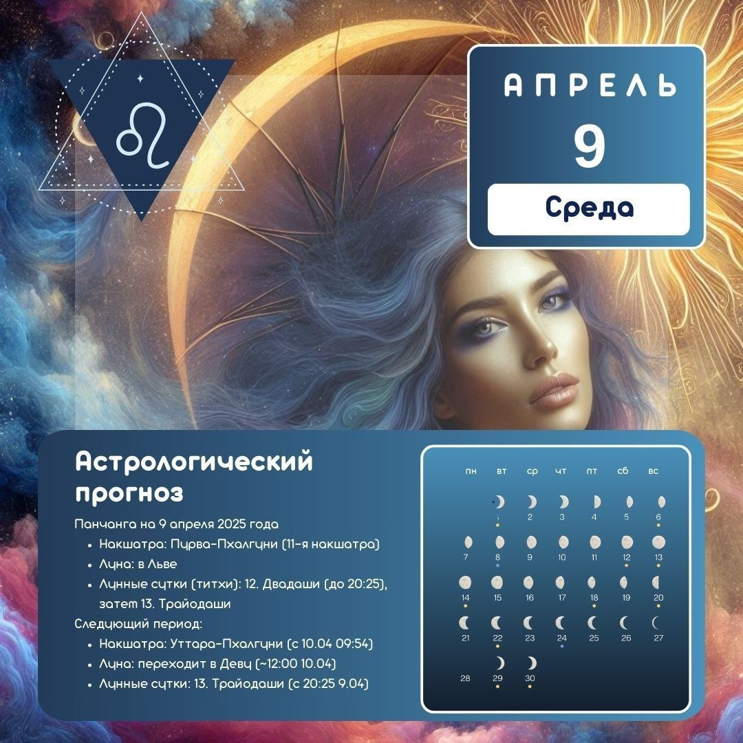 Астрологический прогноз по системе Джйотиш на 9 апреля 2025 года Среда, день Меркурия Общая атмосфера дня: баланс лёгкости и продуктивности Луна во Льве в накшатре Пурвапхалгуни сочетает энергию творчества (Венера) с царственностью Льва (Солнце). Пурвапхалгуни словно шепчет: «Наслаждайся моментом!» — но не забывайте, что Лев требует действий. Совет дня: Утром позвольте себе расслабиться, а после полудня переключитесь на активность. Ключевые периоды: 1. До 15:55 — Ганда йога - Время неоднозначных решений. Избегайте конфликтов, не рискуйте финансами. - Лунные сутки до 20:25 — 12-е (Бхадра) + среда = Сиддха йога. Энергия завершения: избавляйтесь от старого, готовьте почву для нового, да и впрочем, можно и начинать, но не слишком серьезный проект. 2. После 15:55 — Вриддхи йога и - Сиддха йога (благоприятная!) усиливают удачу. Идеально для: - Начала проектов, - Важных переговоров, - Творческих прорывов. - Вриддхи добавит роста: планируйте долгосрочные цели, укрепляйте отношения. 3. Кара