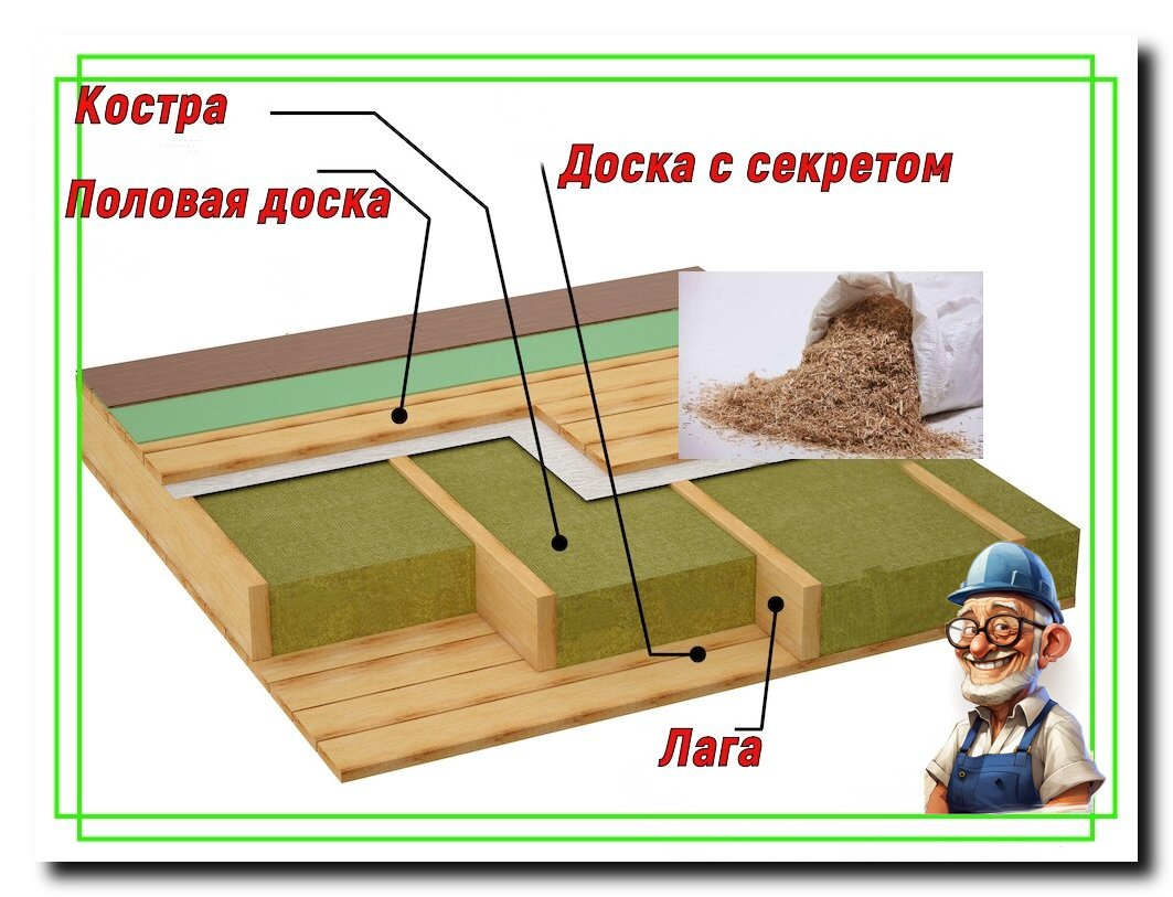 Как я уже упоминал, существует секрет, который может значительно улучшить свойства утеплителя. Возьмите немного глины, размешайте её до консистенции сметаны и добавьте небольшое количество костры. Этот состав значительно улучшит прочность и устойчивость к трещинам. Затем, когда у вас готова подшивка из древесного материала и балки перекрытия, промажьте поверхность этим составом примерно в 3-5 см.