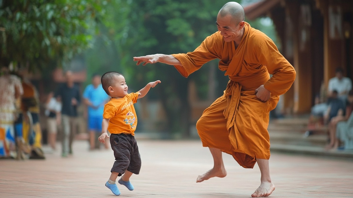 Создано на основе запроса: The monk lifting a child who tripped, teaching with a smile