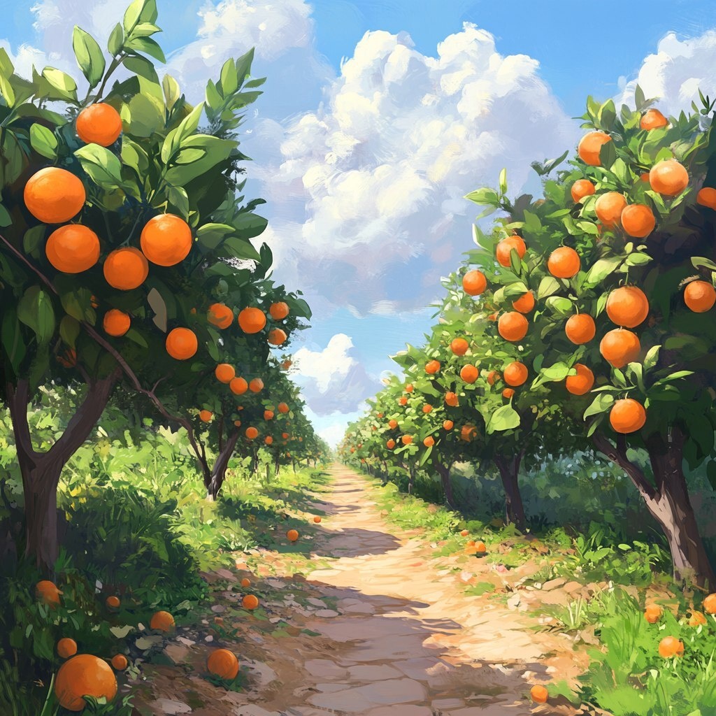 Создано на основе запроса: cute realistic anime style artwork of rows of tangerine trees on an island