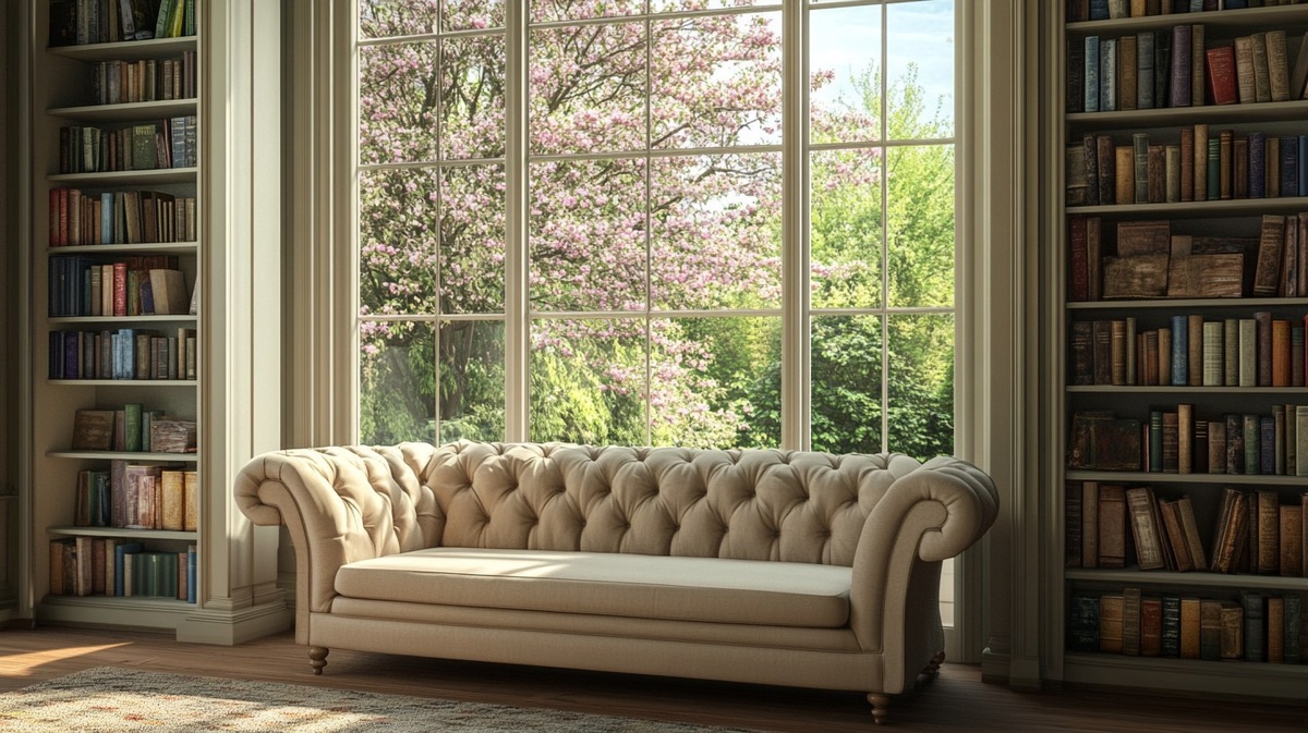 Создано на основе запроса: A photorealistic room with bookshelves, a window showing blooming trees outside, a beige couch with tufted