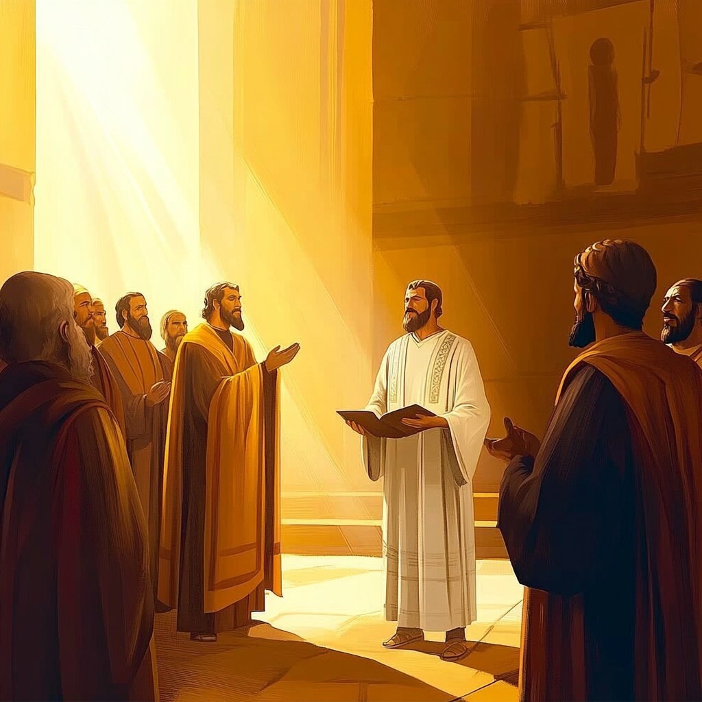 Создано на основе запроса: , A stylized, symbolic illustration of a peaceful man in light robes standing calmly before a Roman governor seated in a grand courtyard. The scene has warm, gentle sunlight, classical architecture in the background, and subtle emotional tension. The style is painterly and reverent, inspired by traditional sacred art, but with a soft, artistic abstraction. Gentle colors, flowing fabric, respectful composition, high detail in facial expressions and architecture.