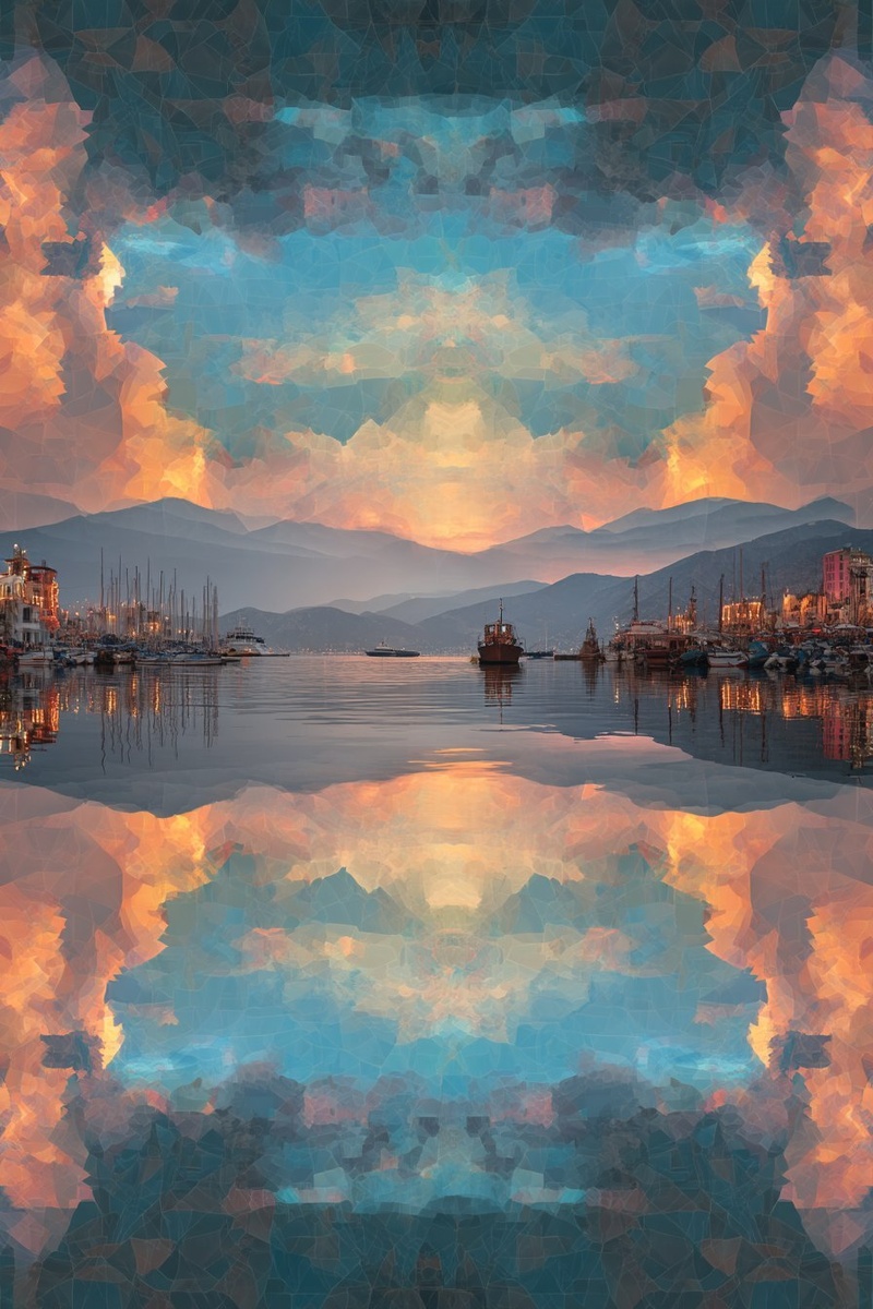 Создано на основе запроса: 🕰️ ⚙️ 🐝 🦋 boat in Mediterranean harbor, a voronoi diagram collage of different time skies and clouds of mixed