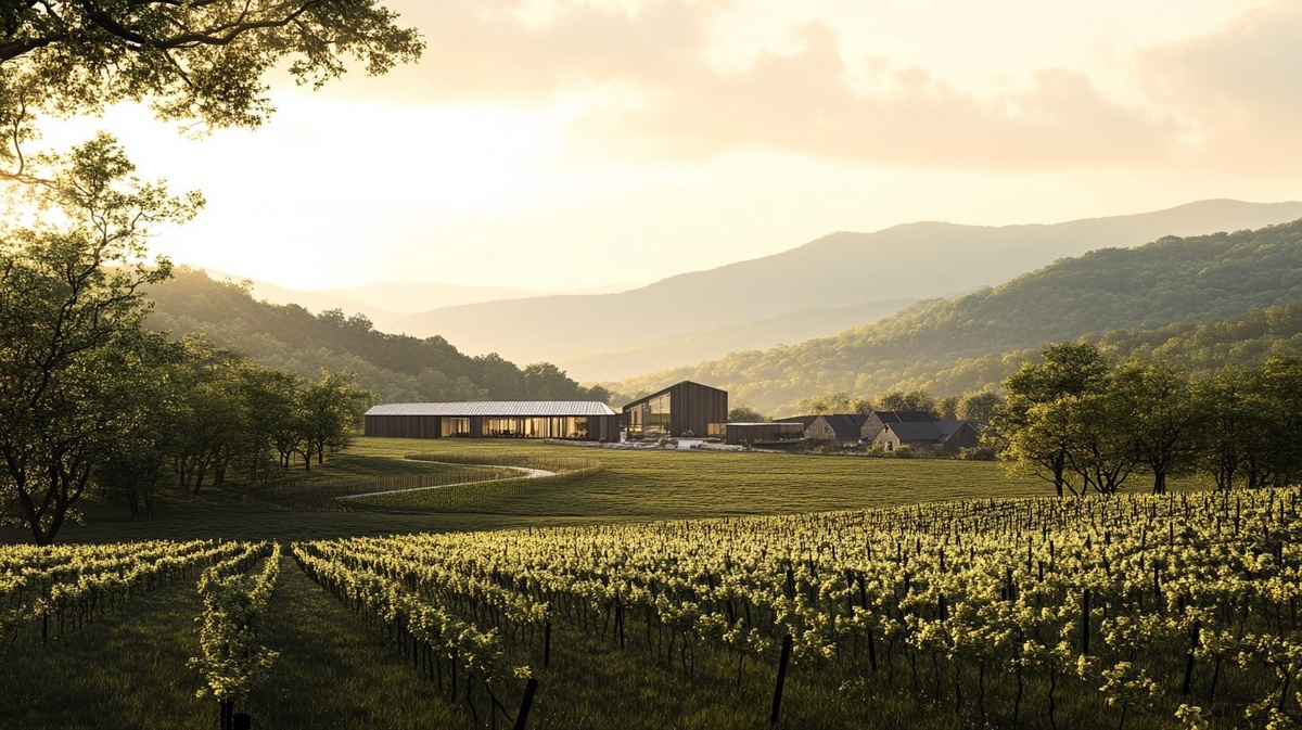 Создано на основе запроса: a modern farm campus with contextual materials in a vineyard field surrounded by the appalacian mountain range of