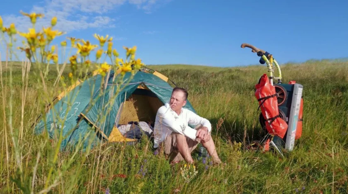 «Иду по самочувствию. Не гонюсь за километрами. Важно не перегореть, не переутомиться. Порой отдыхаю по 1–2 дня, просто живу в палатке, готовлю, читаю — и снова в путь», - рассказывает он.
