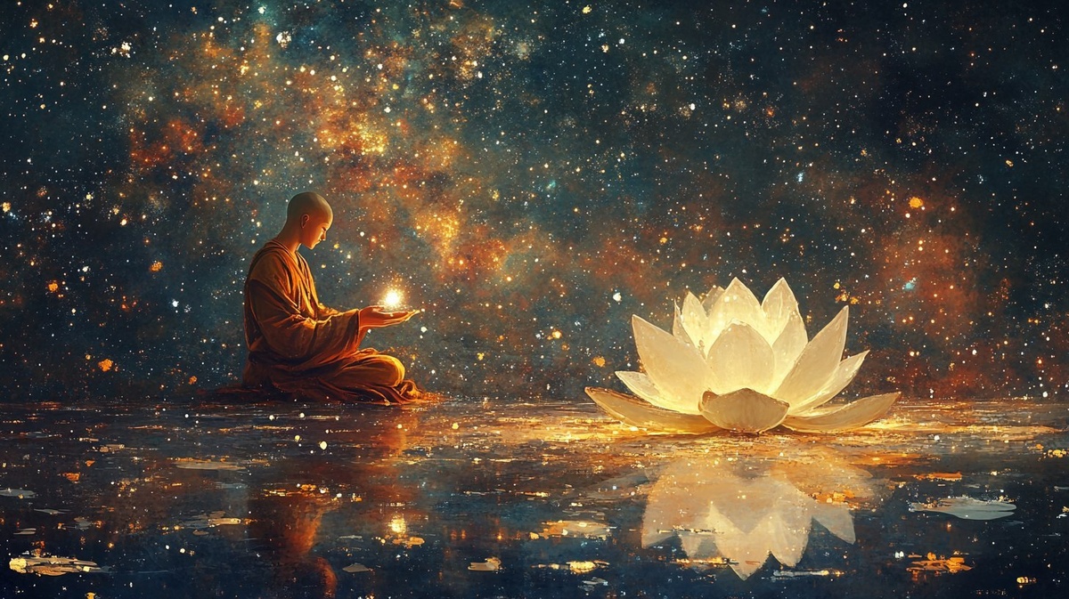 Создано на основе запроса: The monk offering a white lotus on a lake of stars