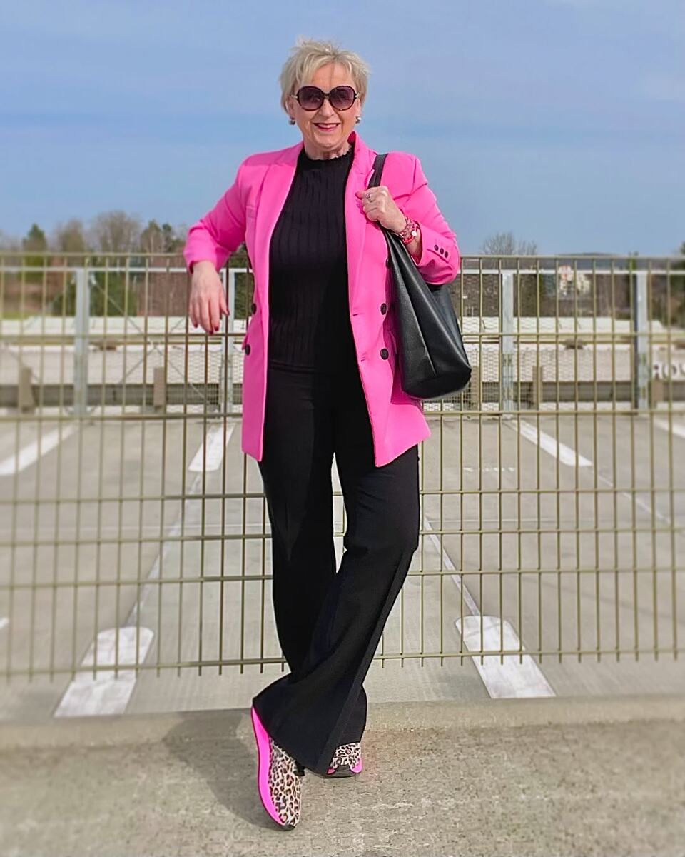 Ярко-розовый пиджак — смелое, живое решение, которое моментально делает образ современным. Он работает как акцент, притягивает внимание, но при этом уравновешен чёрными брюками и топом. Отдельный комплимент — обуви с леопардовым принтом и розовой подошвой.