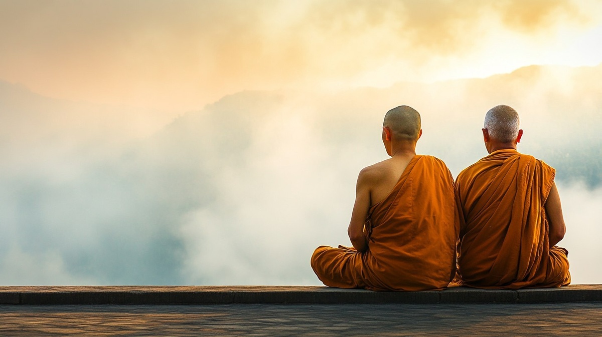 Создано на основе запроса: The monk sitting beside an elderly monk who fades into mist while smiling